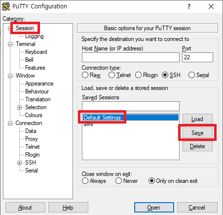 설정 후 아래 사진처럼 Session -> Default Settings 선택 후 Save 하면 설정값이 고정이된다!