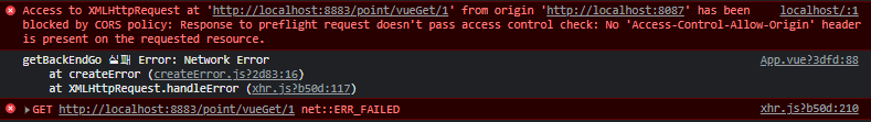 1. axios로 Spring boot연동시 아래 그림처럼 cors 에러가 났다! 위 그림처럼 에러가 날 경우 필자는 이렇게 해결했다. 2. Vue의 메인 폴더(package.json이 있는 곳!)에 vue.config.js를 만들고 아래 코드를 입력 module.exports = { devServer: { proxy: { '/':{ "target":'http://localhost:8883', // Spring boot의 주소 및 포트 "pathRewrite":{'^/':''}, "changeOrigin":true, } } } } 3. Spring boot에서 class하나를 만들어서 아래 코드를 작성 @Configuration public class WebConfig implements WebMvcCo..